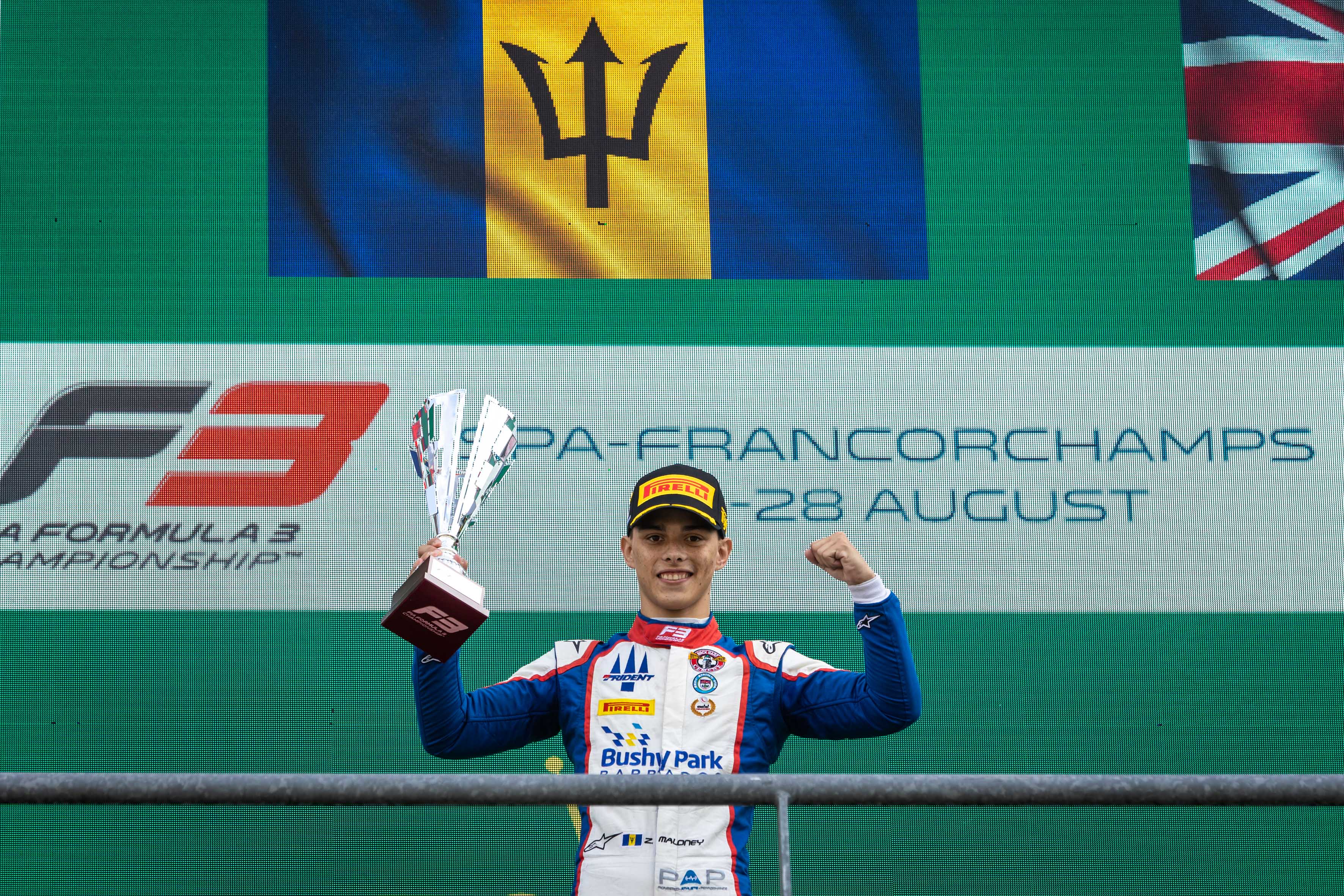The Barbados Motoring Federation (BMF) was quick to congratulate Barbadian Zane Maloney on his first victory in the FIA Formula 3 Championship at the iconic Spa-Francorchamps circuit in Belgium today (August 28). Less than 24 hours after he rolled into retirement following heavy contact in the Sprint Race, the 18-year-old led team-mate Roman Stanek home in the Feature Race in Trident Motorsport’s first double podium of the season.